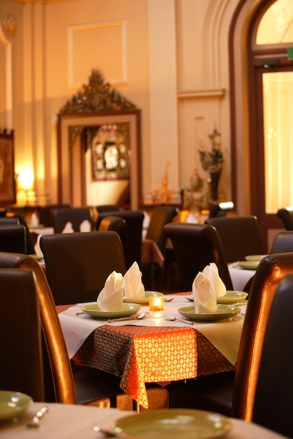 The lovely table settings, with Thai cuttlery and crockery and high back leather chairs.